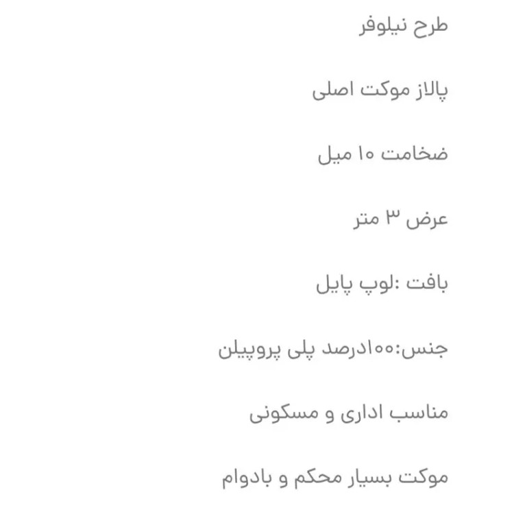 عرض موکت ها براساس 3 متر می باشد و قیمت گذاشته شده براساس یک مترمربع هست سایر توضیحات:ارسال به صورت مستقیم از درب کارخانه به درب منزل مشتری می باشد مناسب برای:اداری و مسکونی جنس:100درصد پلی پروپیلن
